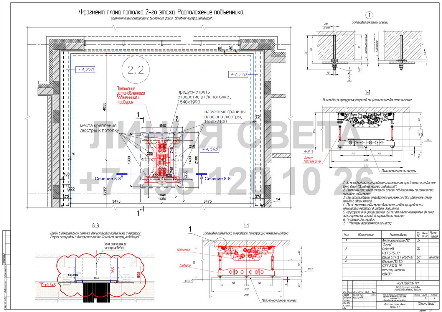 Разработать, изготовить и смонтировать систему подъема для люстры весом 1500кг и габаритами 1650х2100мм